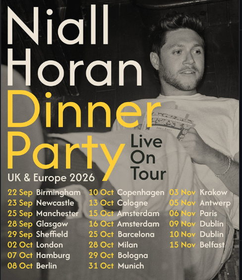 Niall Horan’s Dinner Party tour begins in Birmingham on 22 September 2026.