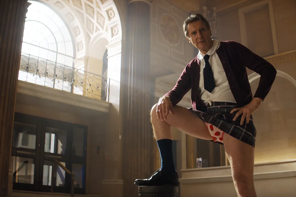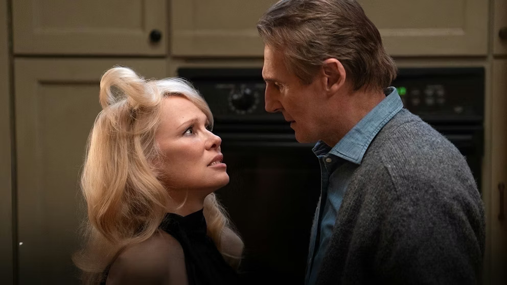 This reboot introduces Frank Drebin Jr., played by Liam Neeson, the son of Nielsen’s iconic detective, now working his own case involving a tech billionaire with a conveniently vague master plan and a device literally labelled “P.L.O.T.”. It’s a knowingly ridiculous set-up, and the film leans into that from the start. Along the way, Drebin crosses paths with Beth Davenport, played by Pamela Anderson, a true-crime writer drawn into the mystery, while Danny Huston plays the kind of smooth, slightly untrustworthy villain the film clearly enjoys poking fun at. The story itself is mostly just a framework for jokes, and that’s very much the point. It moves quickly, rarely pausing too long on plot, instead focusing on keeping the comedy moving.